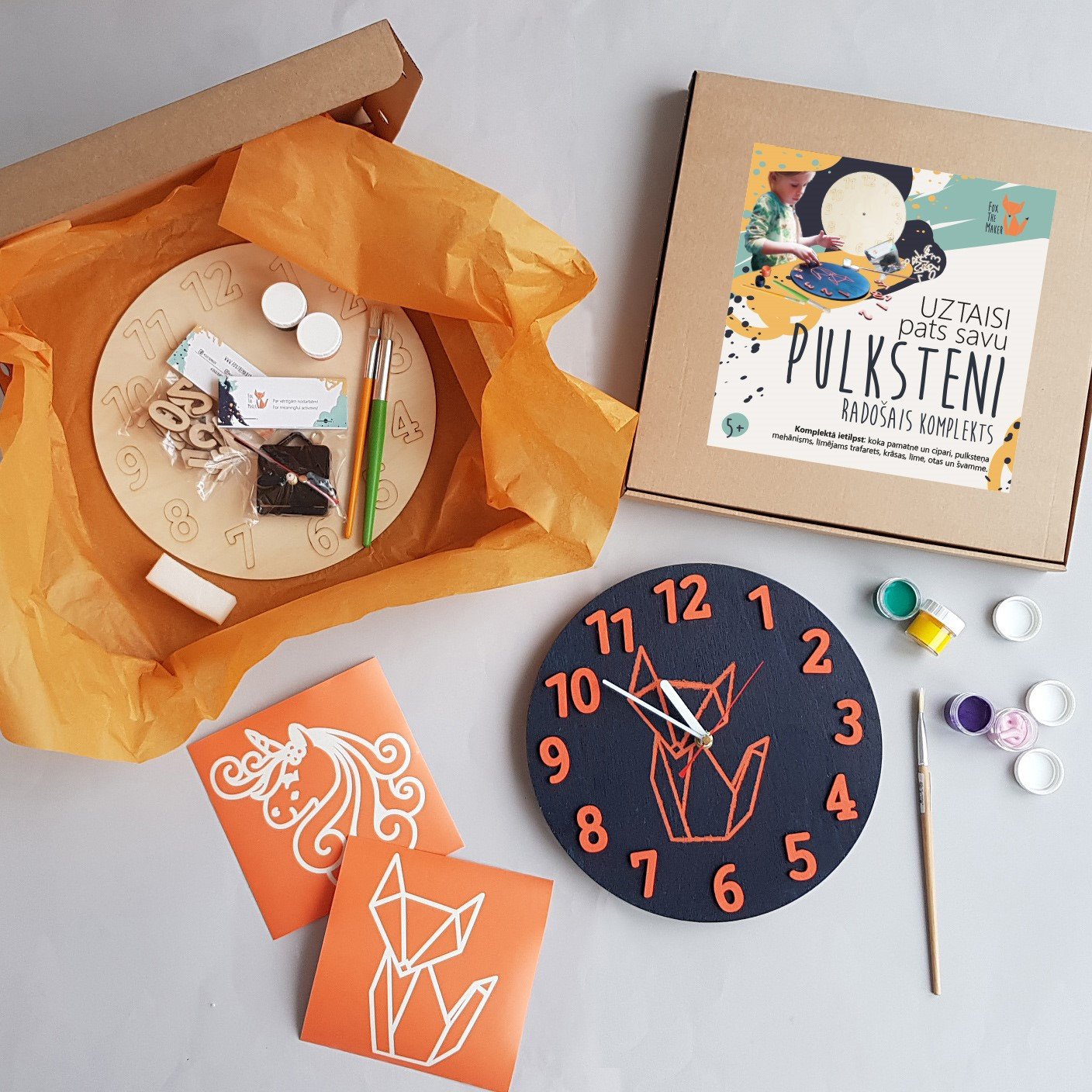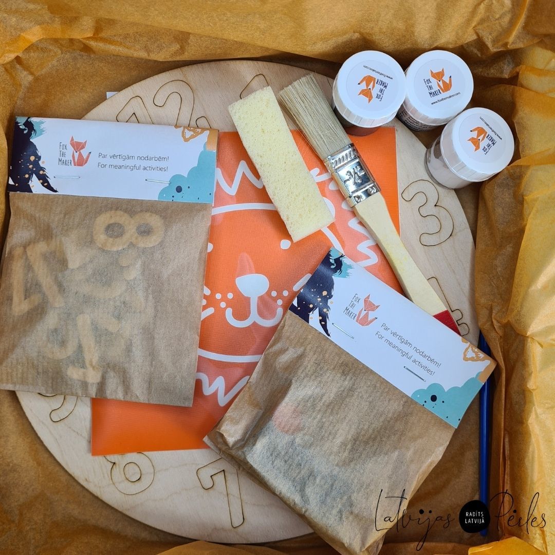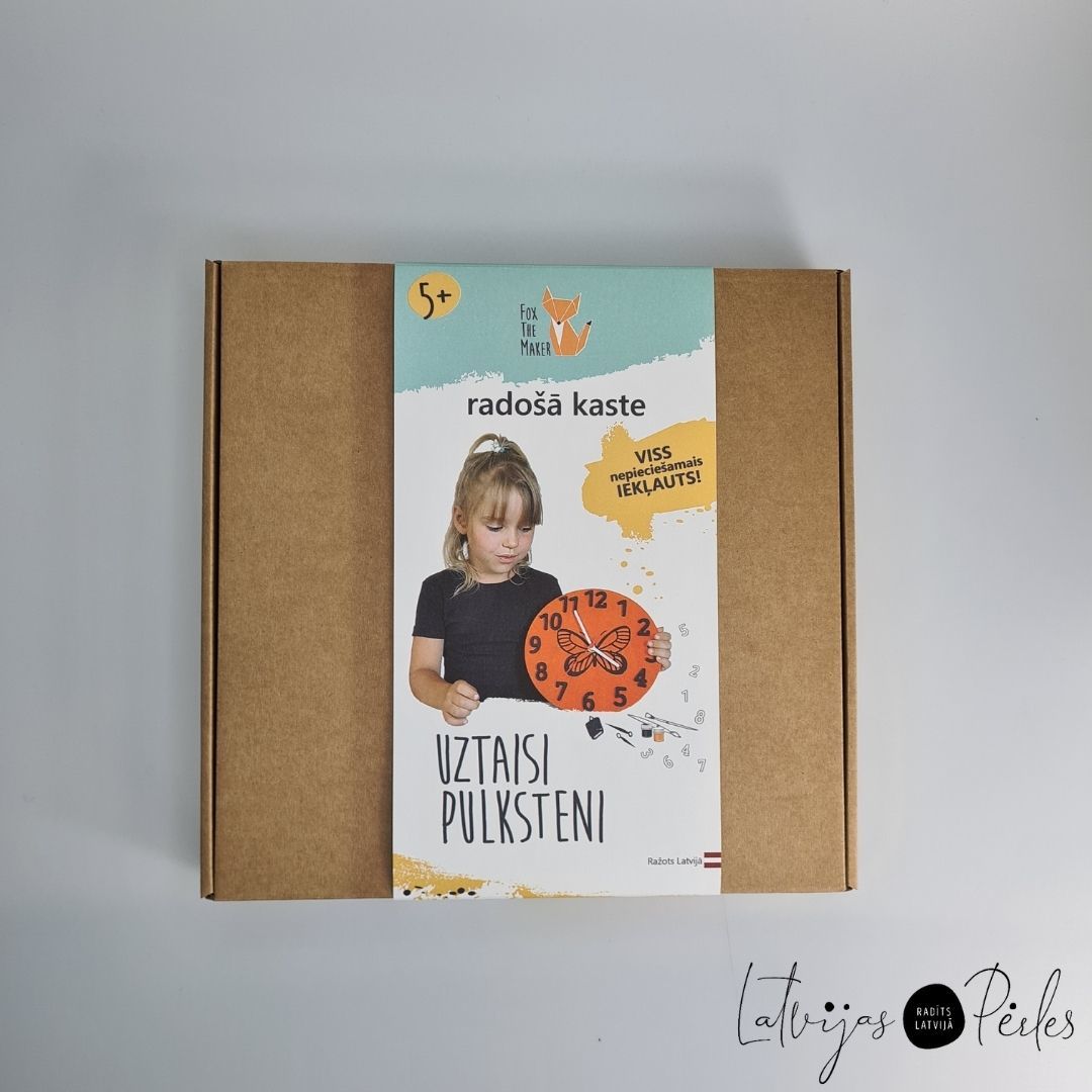 Pulksteņa radošais komplekts ir iespēja bērnam uztaisīt pašam savu īsto sienas pulksteni. Laika noteikšana pēc pulksteņa ir jāapgūst ikvienam bērnam, un daudz aizraujošāk to darīt ar pulkteni, ko esi uztaisījis pats! Koka pamatne kopā ar saskaņotām, kontrastējošām akrila krāsām dos iespēju radīt gaumīgu pulksteni, kas iederēsies ikvienā bērnistabā. Cipari veidoti pietiekami lieli, lai būtu izteiksmīgi un viegli pamanāmi. Pulksteņa mehānisms ir kluss, bez tikšķēšanas. Ciparu vietas ir iezīmētas uz koka pamatnes un redzamas arī pēc nokrāsošanas, kas palīdzēs pielīmēt ciparus pareizajās vietās. Visi nepieciešamie materiāli iekļauti kompletkā. Pulksteņa darbībai nepieciešama viena AA baterija, kas nav iekļauta. Pulksteņa radošajā komplektā ietilpst: koka rāmis un cipari 1-12; pulksteņa mehānisms; pašlīmējošs dizains; 2 toņu krāsas; 2 izmēru otas un sūklis krāsošanai; līme. Dizaini: Lapsa Vienradzis Dino