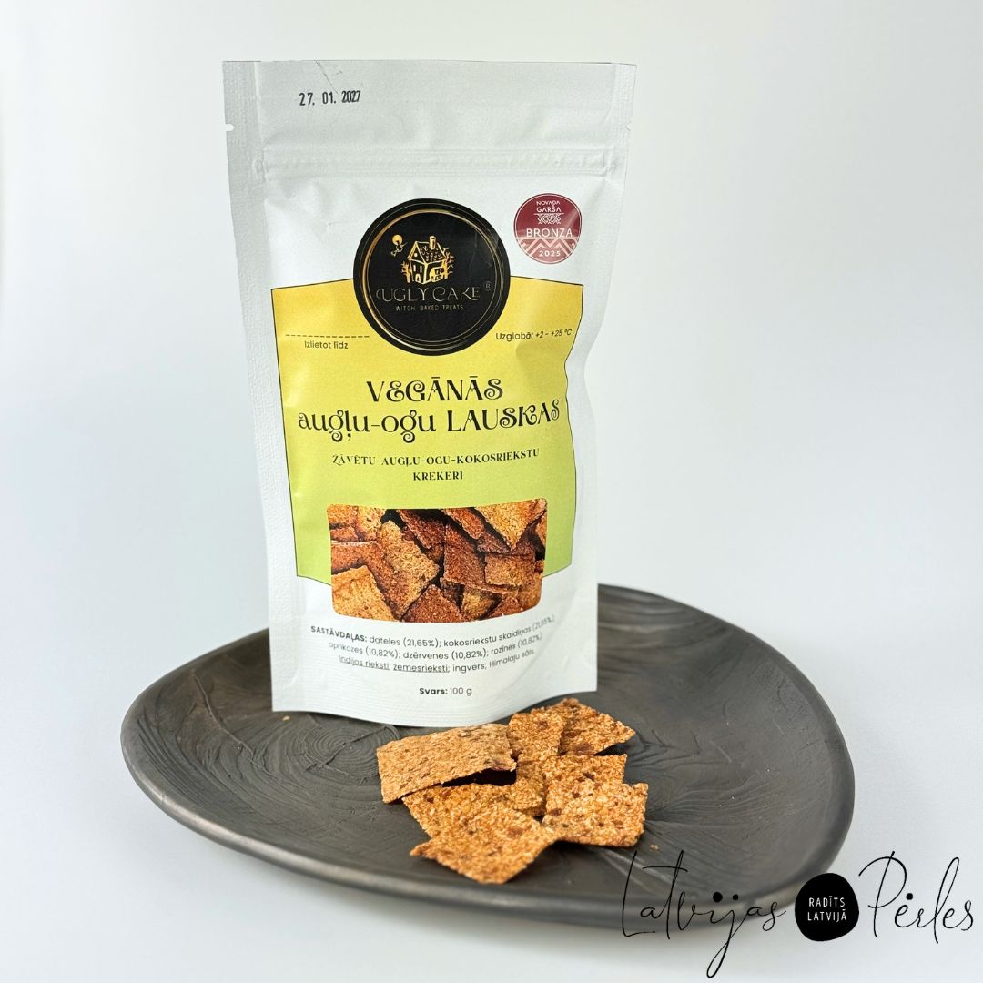 Žāvētu augļo, ogru, kokosriekstu krekeri. Sastāvdaļas: Dateles (21.82%); dzērvenes (10.82%); rozīnes (10.82%); Indijas rieksti; zemesrieksti; ingvers; himalaju sāls. Svars: 100g