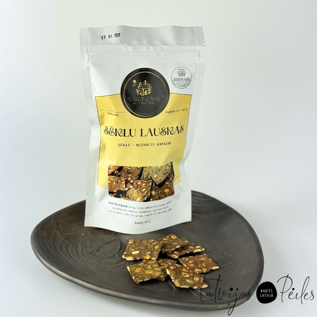 Sēklu - bezmiltu krekeri. Sastāvdaļas: ķirbju milti, sēklas 51%(ķirbju sēklas, saulespuķu sēklas, linsēklas), agavas sīrups, kokosriekstu eļļa, ķimenes, melnā un himalaju sāls. Svars: 100g